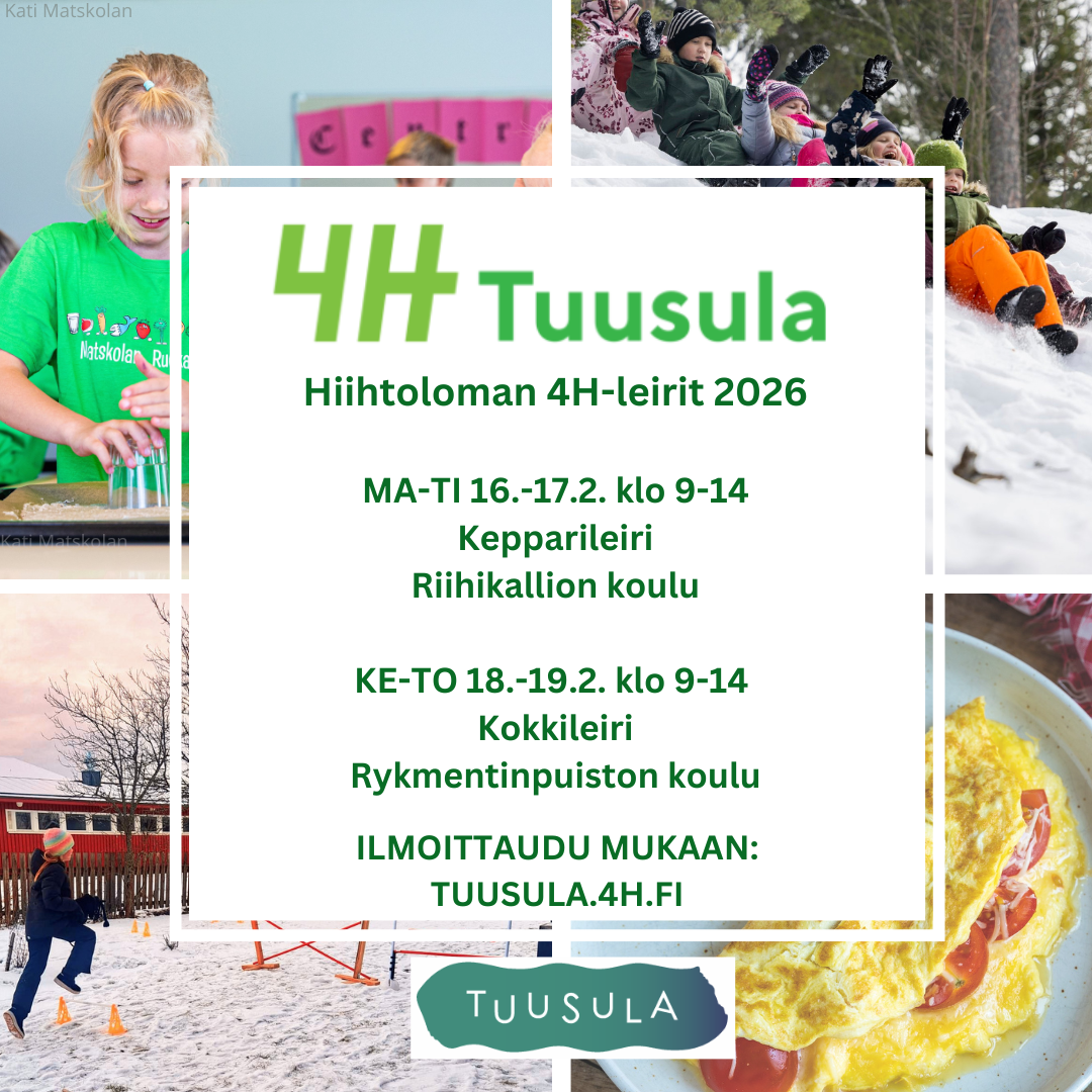 Tuusulan 4H-yhdistys järjestää hiihtolomalla keppihevosleirin ma-ti 16.-17.2. Riihikalliossa sekä Safkasankarit-kokkileirin ke-to 18.-19.2. Hyrylässä. Leirit ovat päiväleirejä klo 9-14.